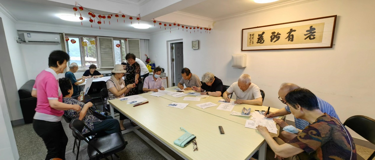 居住在育新社区和柏儒苑社区的离休干部和老教授们,不便来到学校,但热情高涨,以支部为单位,在社区的活动室里或者自行在家中参加寄语书写活动。