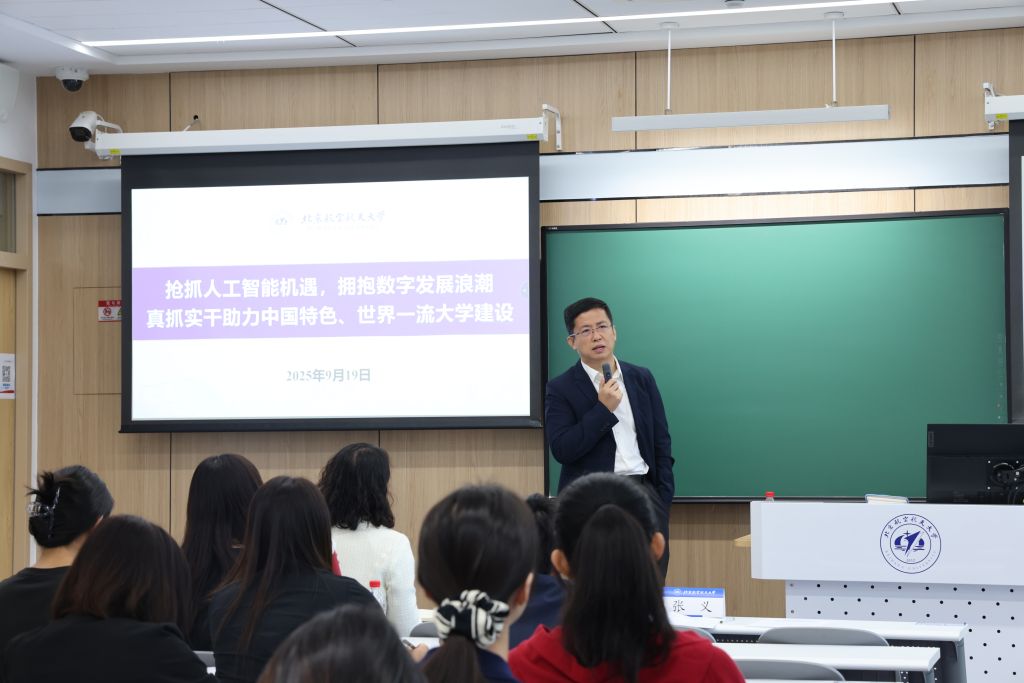 校长助理、党政办公室主任、机关党委常务副书记张义以《抢抓人工智能机遇 勇立教育数字化时代潮头》为题作专题讲座。他系统阐述了教育数字化对加快建设教育强国、抢占全球教育制高点、支撑中国式现代化的重要战略意义,并结合北航“数智赋能三年行动计划”,从夯实基础、构建生态、提升能力三方面,介绍了我校在人工智能与教育深度融合、科研范式转型及治理效能提升方面的具体举措与重点任务。他寄语管理服务系列教职工,要牢牢把握办学治校、教学科研、人才成长等规律,紧密围绕学校中心工作,立足本职服务大局,积极主动拥抱数字化,转变观念、提升素养、真抓实干,为加快建设中国特色、世界一流大学贡献智慧和力量。