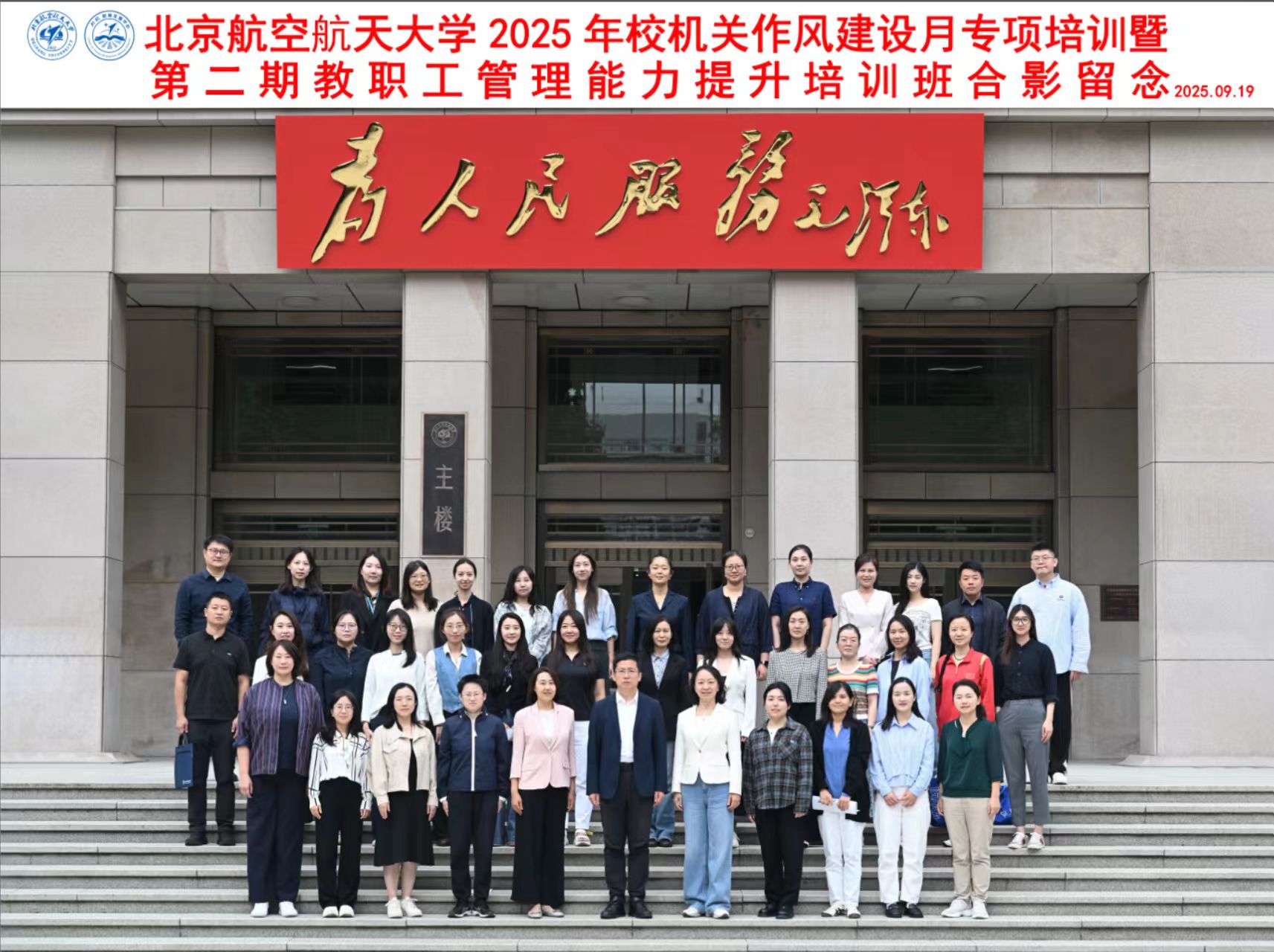 北航新闻网9月25日电(通讯员 王孚尹/文 王旭 龚德艳/摄影)9月19日上午,由机关党委、教师发展中心联合组织的2025年校机关作风建设月专项培训暨第二期教职工管理能力提升培训班开班仪式在学院路校区老主楼主401教室举行。党政办公室、教师发展中心等单位负责人,以及京杭两地近60名教职工以线上线下相结合方式参加。仪式由教师发展中心主任李红捷主持。