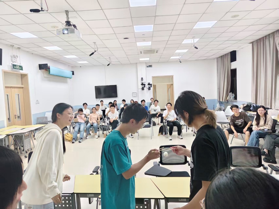 “玉兔传月饼”环节将现场氛围推向顶峰。参与游戏的同学们需与小组伙伴凝心聚力、默契配合,手持筷子小心翼翼地将象征“月饼”的乒乓球从起点平稳传送至终点。小球掉落的清脆声响与同学们的笑声交织在一起,共同编织成一段鲜活而温暖的中秋记忆。