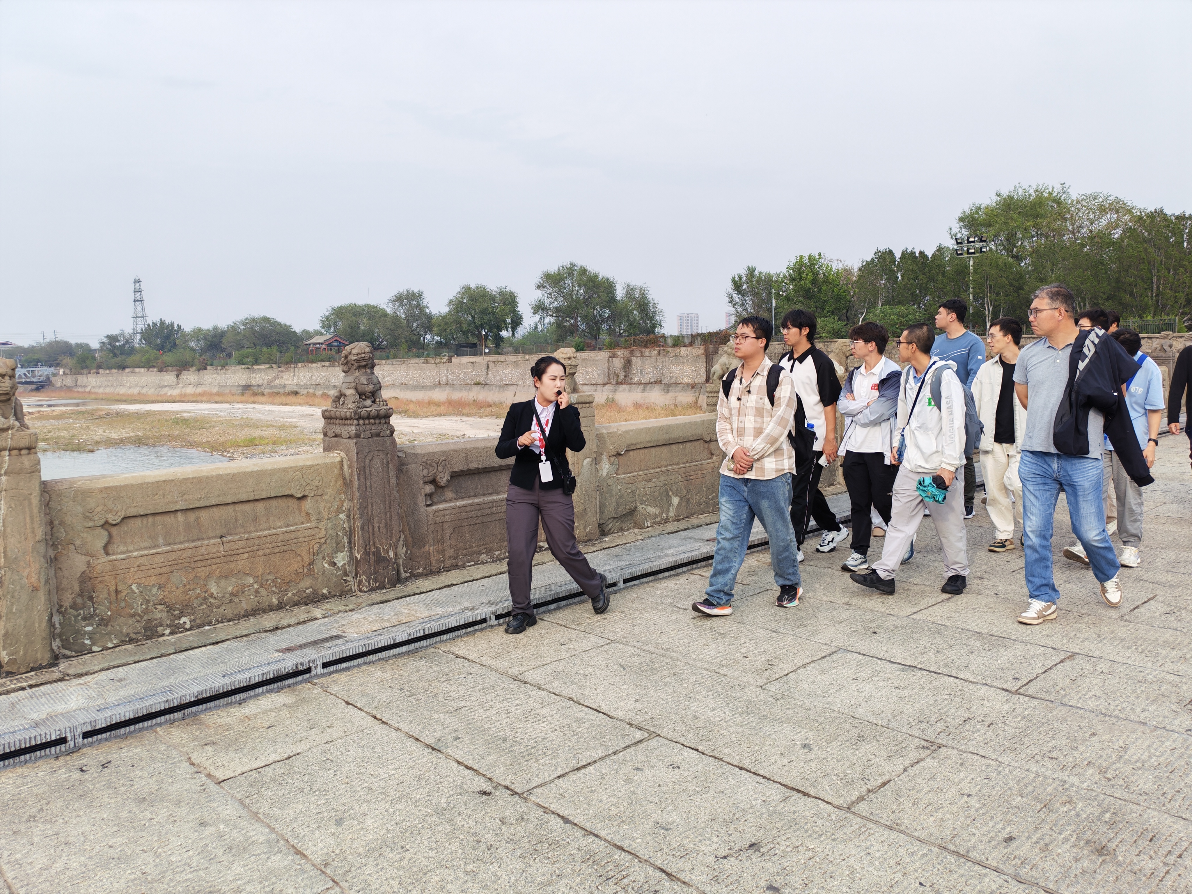 随后,同学们怀着崇敬的心情踏上卢沟桥进行实地教学。行走在斑驳的桥面上,注视着形态各异、饱经沧桑的石狮,触摸着刻满岁月痕迹的桥栏,同学们在这座标志着中华民族全面抗战起点的古桥上,切身感受那段全民族救亡图存的悲壮历史。秋日的阳光洒在桥面上,远处永定河水静静流淌,讲解员深情讲述着1937年7月7日那个不眠之夜的历史细节,让历史书本中的记载变得真实可感、直击心灵。