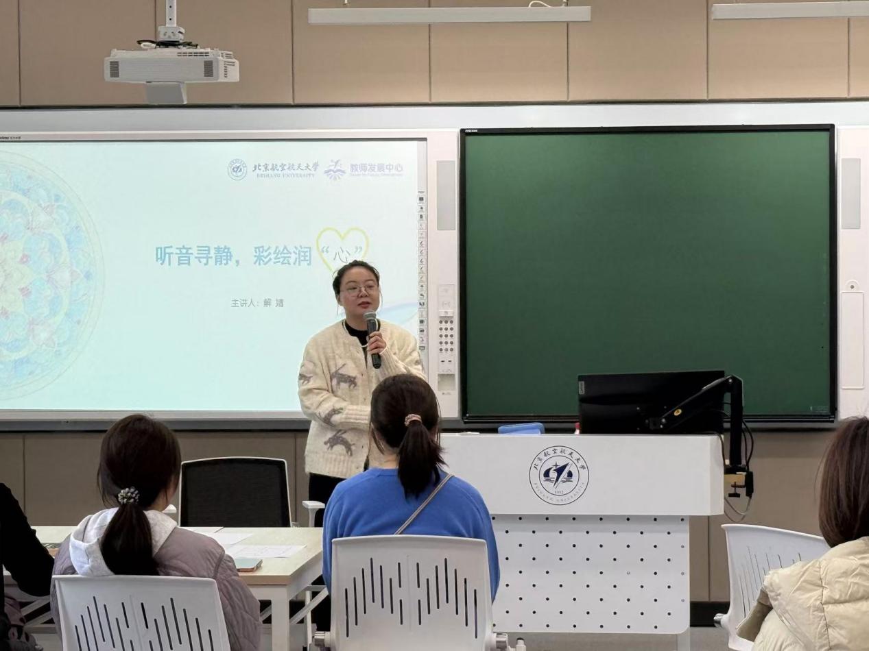 北航新闻网10月23日电(通讯员 朱蕊寒/文 高一丹/摄影)为助力教职工提升自我调适能力、激活内在心理能量,近日,教师发展中心特邀人社部中级心理训练师解婧,带来《听音寻静 彩绘润心》主题工作坊。引导教职工在艺术创作中沉静思绪、探索自我,从而获得内心的疗愈与力量。