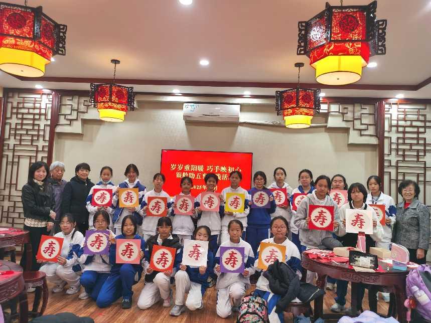 10月23日,北航实验学校(中学部)剪纸社的20名同学,聆听老年社团手工艺术协会的老师讲解非遗剪纸技艺。在老师们的耐心指导下,同学们凝神聚力剪“寿”字,完成后工整写下自己的名字,让每一幅作品都成为传递敬意的独特载体。