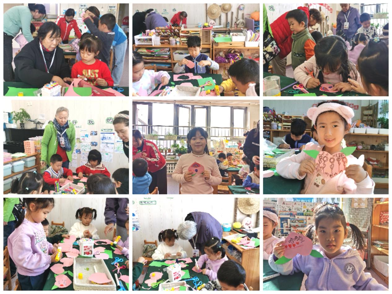 10月21日下午,北航幼儿园大三班30名小朋友在老年手工艺术协会老师的指导下,一起用卡纸为寿星制作寿桃贺卡,祝爷爷奶奶健康快乐。小朋友们有的画花朵、小草,祝爷爷奶奶笑得像花朵一样;有的画白云、彩虹,祝爷爷奶奶好好吃饭、好好睡觉、好好锻炼、身体棒棒。