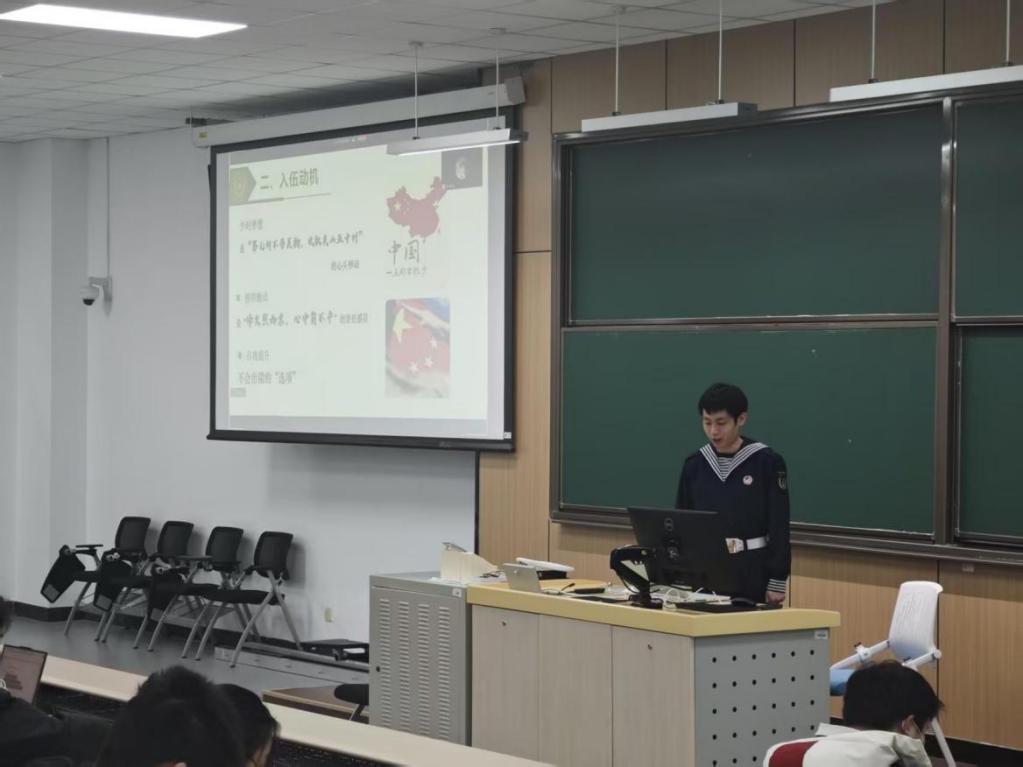 宣讲现场,钱景昊同学以亲身军旅经历为脉络,用真挚的情感、生动的细节,深情回溯了自己的入伍初心与海军军营岁月。怀揣着对祖国的赤诚与对军旅的向往,他于2022年毅然投身中国人民解放军海军队伍,将青春热血挥洒在蓝色海疆。服役期间,他始终以高标准严格要求自己,在高强度训练中刻苦钻研、奋勇争先,不仅斩获3000米跑步项目银牌,更凭借优异表现荣获“四有”优秀士兵嘉奖,用汗水与实绩生动诠释了新时代军人“听党指挥、能打胜仗、作风优良”的使命担当。