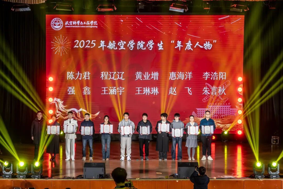 随后,学院举行了2025年学生荣誉表彰大会,集中总结并表彰了过去一年中在学生工作、学术科研、文体活动等方面取得突出成绩的学生团体与个人,授予10名同学2025年航空学院2025年学生年度人物荣誉称号,授予10名同学航空学院学生年度人物提名奖。学院领导为获奖学生颁奖,勉励全体航空学子以优秀朋辈为榜样,将个人理想融入国家航空事业的宏伟蓝图。