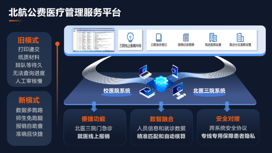 “每次去北医三院看完病,不光要整理打印报销材料,还要专门跑一趟校医院递交,遇上材料不全还要来回补”“材料投递后仿佛石沉大海,也不知道报了没有”此前,不少师生在院外就医费用申报时都有这些困扰。为破解这一民生痛点,在学校主要领导的高度重视和关心支持下,校网络信息中心和校医院联合开发了北航公费医疗管理服务平台。平台开发面临的核心挑战是如何打通学校和北医三院系统之间的技术壁垒,开发团队主动放弃暑假休息时间,加班加点打磨方案,从需求梳理到功能优化,顺利实现多类数据的实时同步与精准匹配,这背后是团队近百个日夜的攻坚克难与对“安全”“精准”的极致追求。
