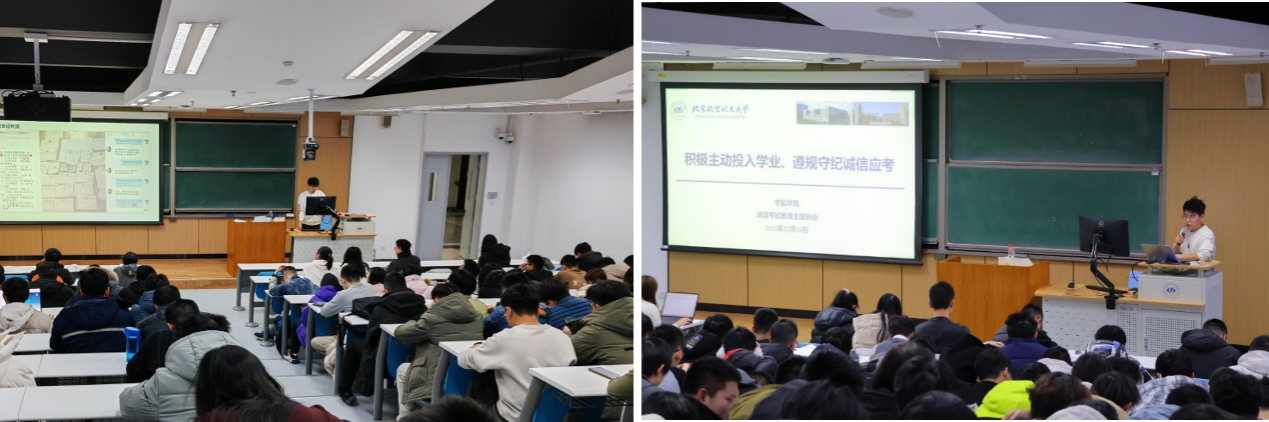 同时,学院还面向本学期需参加期末考试的学生开展了《积极主动投入学业、遵规守纪诚信应考》诚信考试教育,旨在严肃考风考纪,营造公平、公正、清朗的考试环境。班会由各班辅导员组织开展。期末考试不仅是对知识的检验,更是对品格的试炼。诚信,是学术的基石,也是做人的根本。《北航学生违纪处分规定》明确了考试违纪和作弊行为的认定标准及处分后果,凡是触碰将导致严重后果。同学们务必摒弃侥幸心理,认真复习、积极备考,严格遵守考场纪律,用真实的努力和水平接受检验。