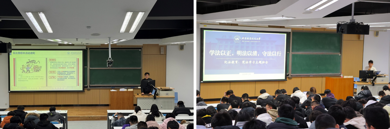 宪法是国家的根本法,与我们每个人的学习生活息息相关。在《学法以正,明法以清,守法以行》宪法学习主题班会中,辅导员通过案例警示,让同学们深刻认识到:无论是盗窃财物、传播谣言、还是利用宗教妨碍教育秩序、乃至侮辱国旗,都是对法律法规和学校纪律底线的触碰,必将受到法律惩处和校规严惩,直接影响评奖评优、保研升学乃至个人前途。同学们必须牢固树立法治观念,明确行为边界,做知法、懂法、守法的北航人。