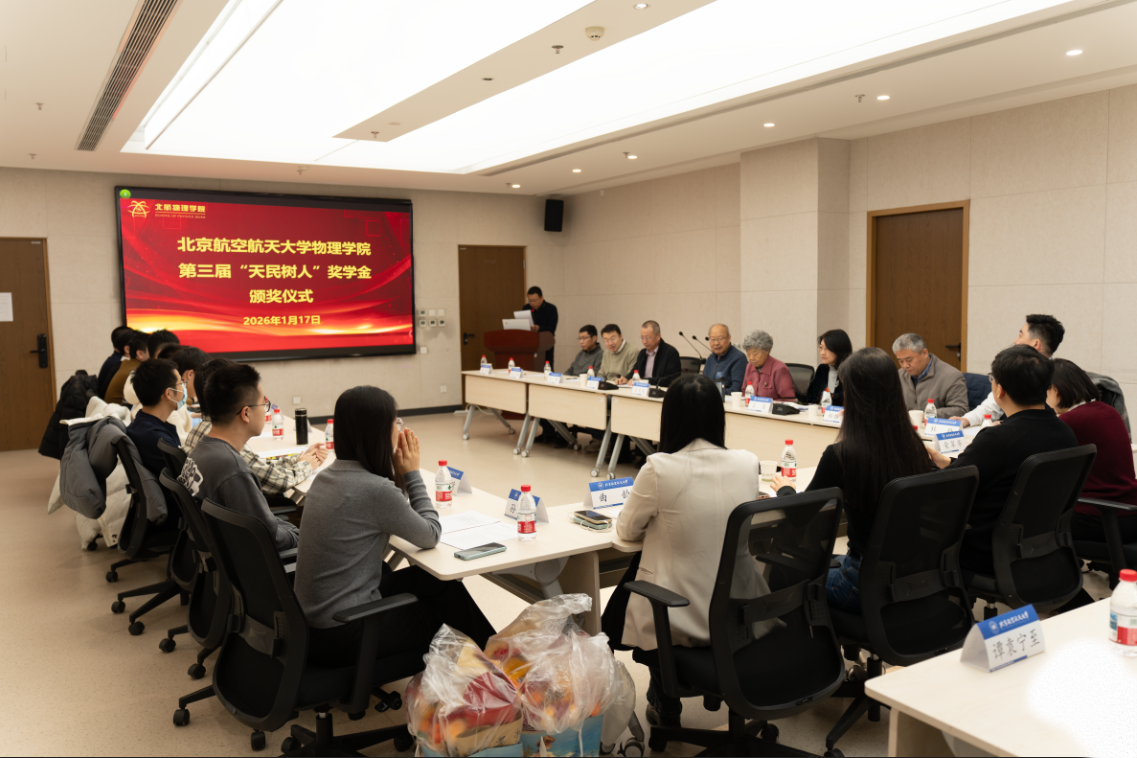 北航新闻网1月19日电(通讯员 宋树洋 朱一中/文 崔轩铭/摄影)1月17日上午,物理学院第三届“天民树人”基金颁奖仪式在沙河校区主楼C座511会议室举行。“天民树人”基金捐赠人、北航理学院原院长王天民教授,基金捐赠人、卫生部妇幼保健司原副司长刘克玲女士,物理学院负责人、教师代表、辅导员及获奖老师与学生参加了颁奖仪式。