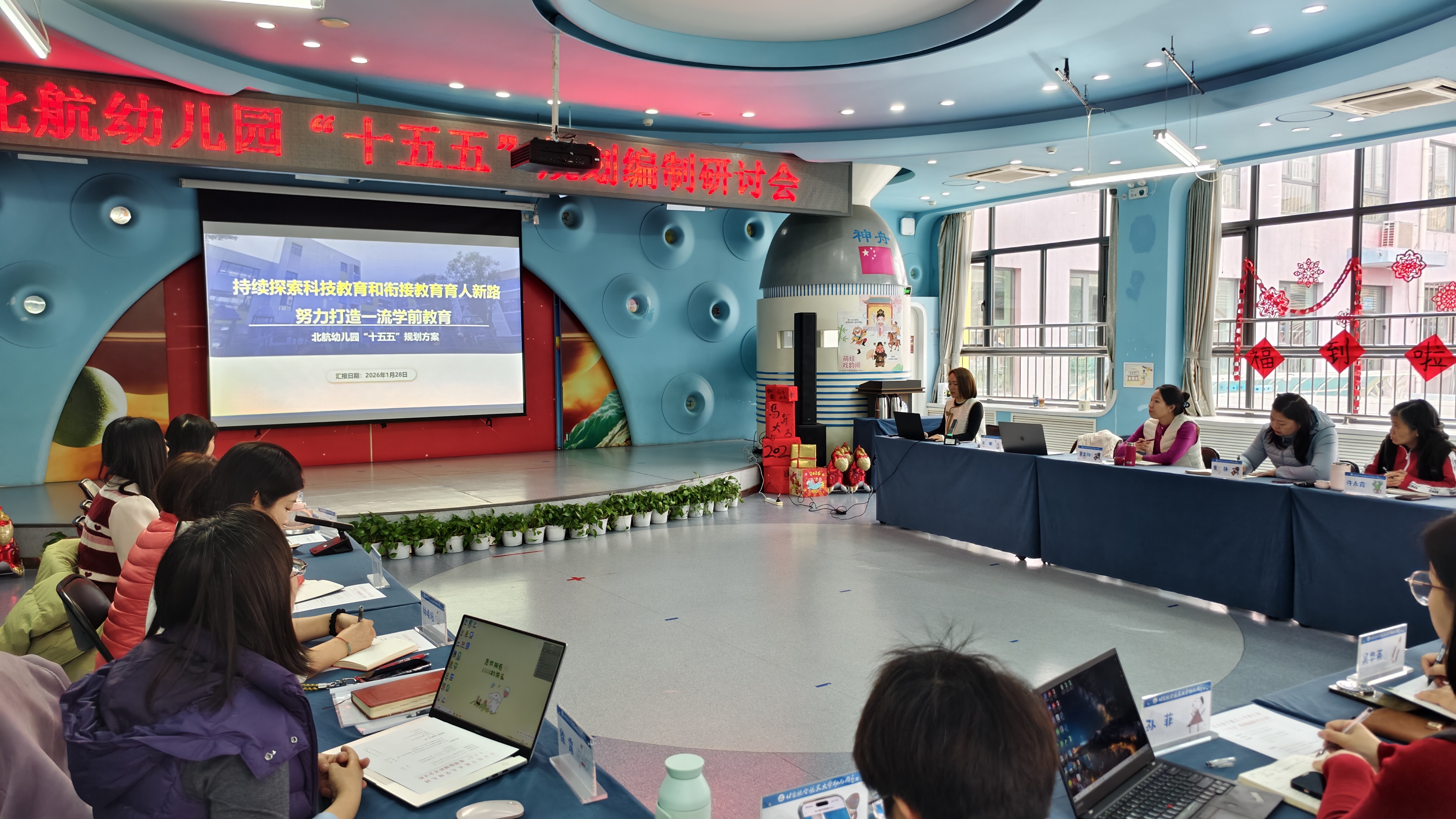 北航新闻网1月28日电(通讯员 马臻)1月28日,北航幼儿园组织召开“十五五”规划编制专题研讨会,特邀海淀区教师进修学校学前教研室主任李峰、北京融媒体教育中心《学前教育》编辑部副主编程洁、原空军直属机关蓝天幼儿园业务园长吴华英三位学前教育专家入园指导编制工作,幼儿园部分办公会成员及骨干教师代表参会。