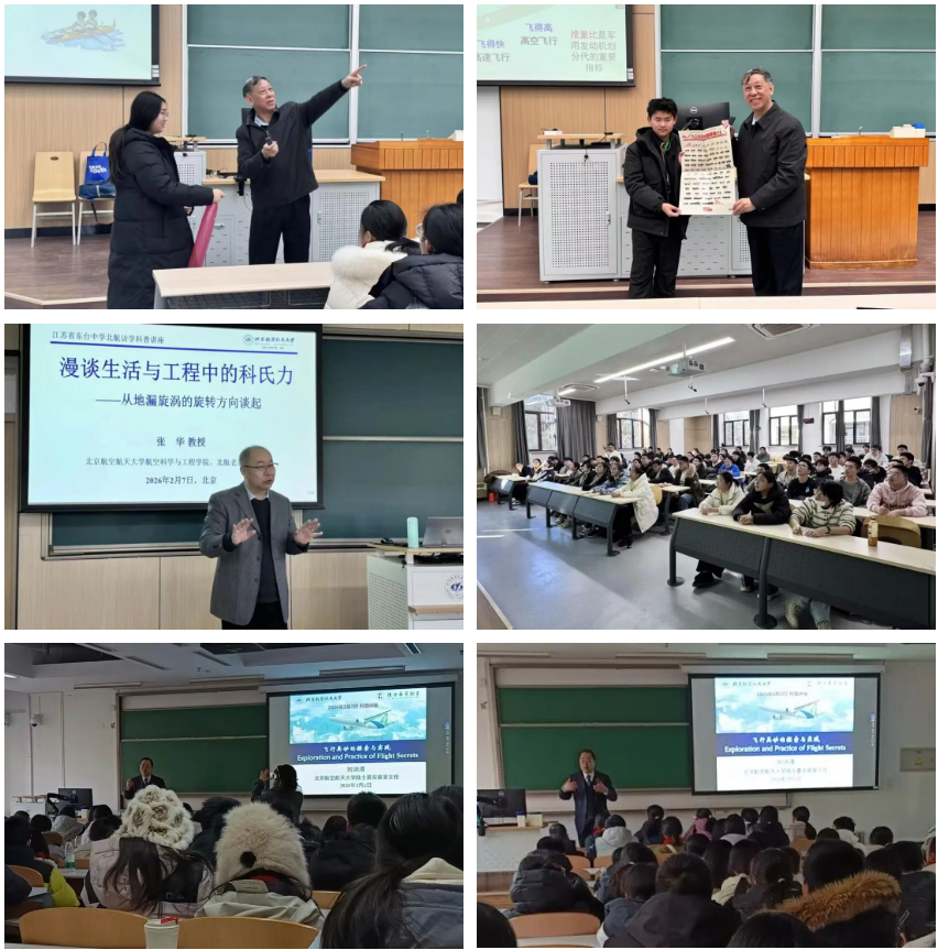科研探索之外,陈志英教授、张华教授、刘沛清教授为650余名江苏学子带来精彩纷呈的专题讲座——《飞行器设计的基本科学原理》专题讲座,以严谨细致又不失生动的讲解,让同学们清晰认识到飞行器设计背后的科学逻辑,进一步夯实了大家对航空航天领域的科学认知基础;《漫谈生活与工程中的科里奥利力》与《两个轱辘的自行车为什么不易倒下——漫谈自行车的运动稳定性》两场讲座,将抽象的物理原理与日常生活、航空工程实践紧密结合,让大家明白,看似简单的生活现象背后,蕴藏着深刻的科学道理;《飞行奥妙的探索与实践》专题讲座,以通俗易懂的语言和生动鲜活的案例,系统揭示了飞行器从萌芽到成熟的演化历程,带领同学们走进飞行的奇妙世界。报告现场掌声不断、互动热烈。