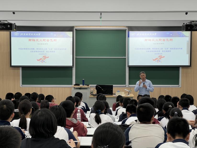 参观结束后,北航老教授报告团陈志英教授为师生一行带来《脚踏风火轮去飞翔》主题科普讲座。陈志英以哪吒“风火轮”为引,生动阐释了飞行器升力与推力等基本原理,并介绍了飞机、火箭等不同飞行器的运行特点,同时围绕中国空间站建设、载人航天工程、嫦娥探月、天问一号火星探测等重大科技成就,进一步讲述了科技创新和科学探索的重要意义,勉励学生们厚植家国情怀,涵养科学精神,树立探索未知、勇于创新的志向。