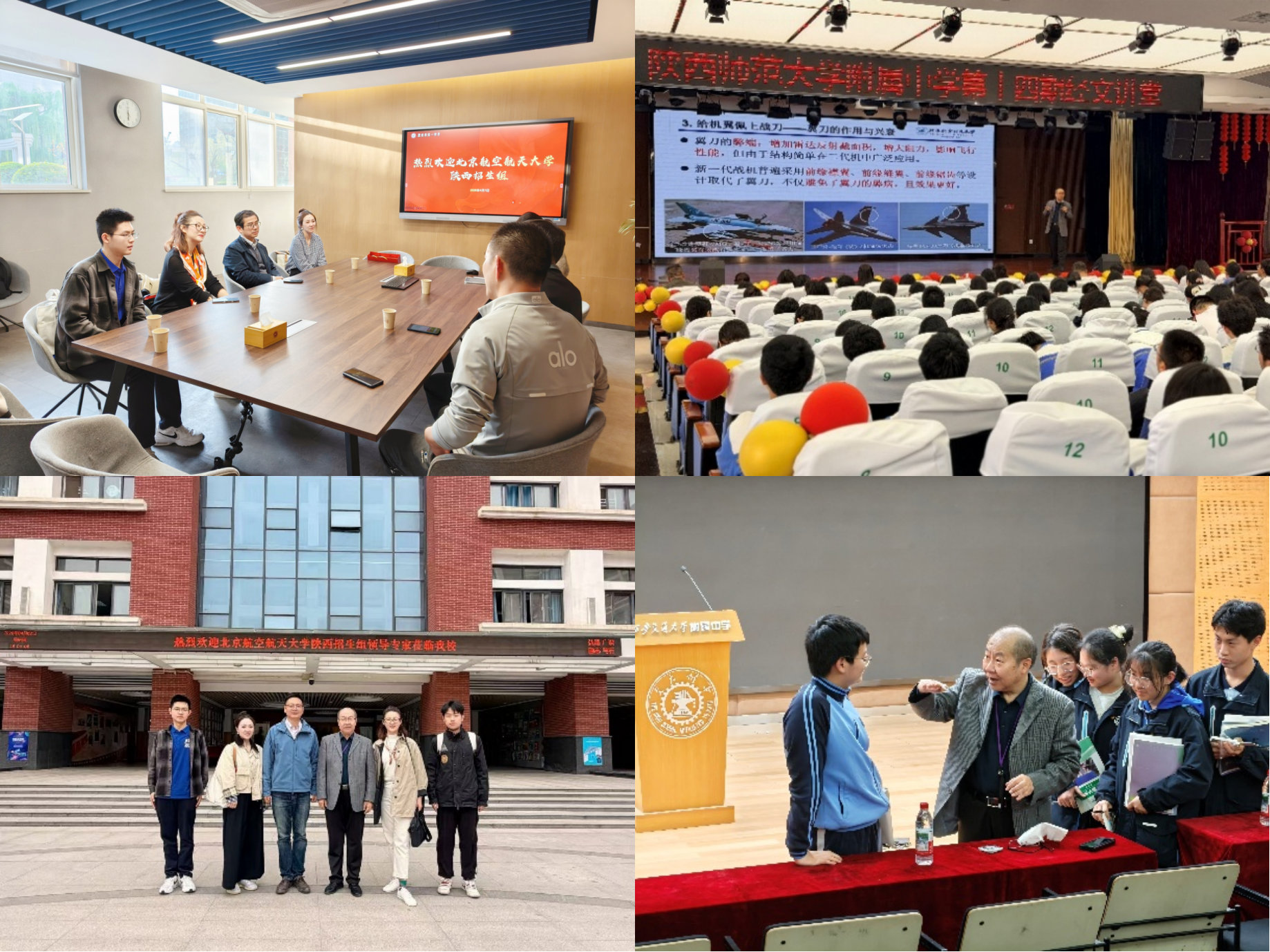 在西安高新一中,高新一中相关领导与招生组成员座谈,并陪同招生组成员参观校园育人环境,介绍学生整体培养情况。在陕西师范大学附属中学,航空科学与工程学院张华教授为500余名学生开展科普宣讲《漫谈飞机设计中的空气动力学奥秘》,深入浅出地呈现深奥的科学原理,在中学生心中埋下航空报国的理想之种。