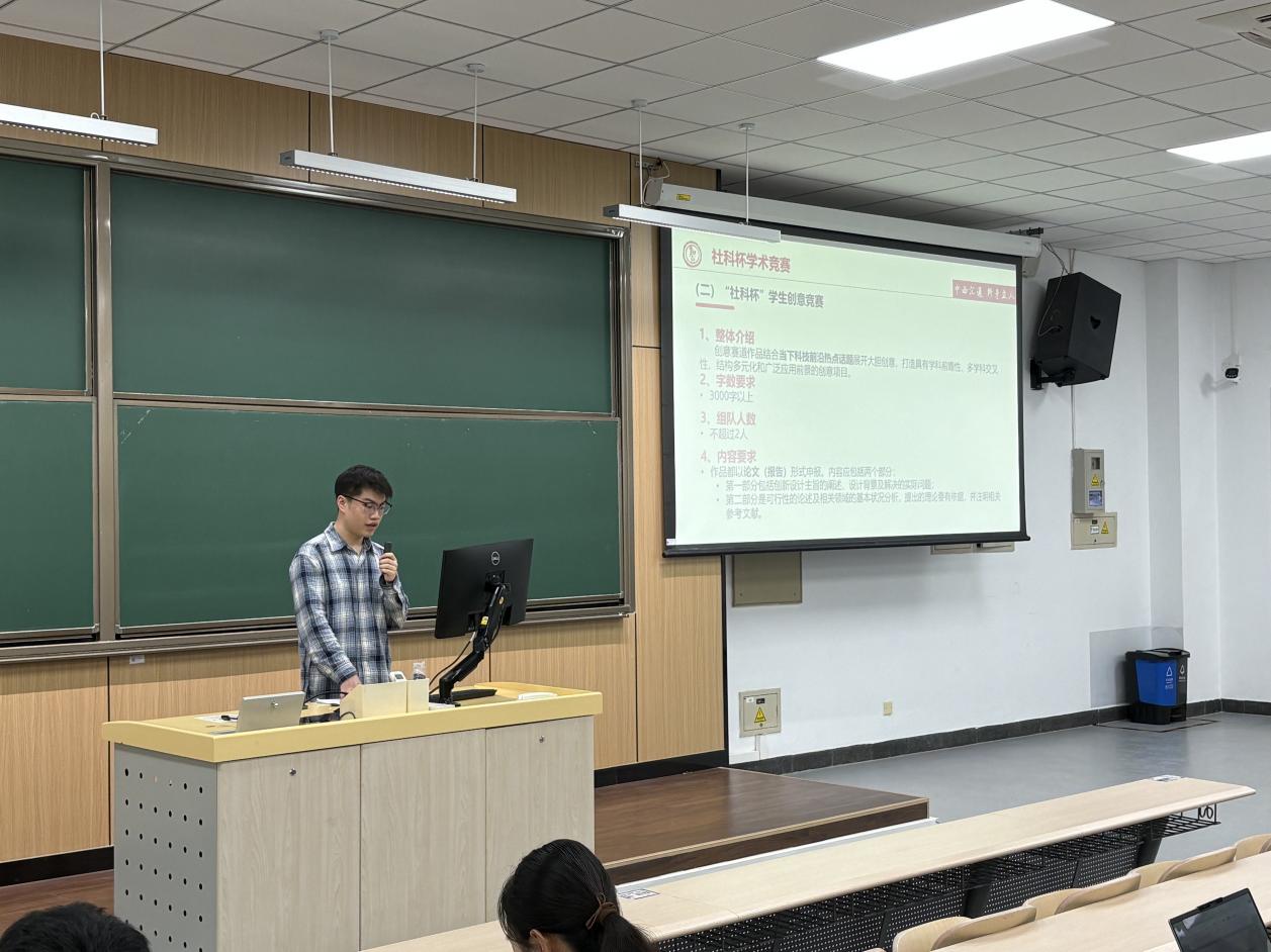 随后,书院辅导员乔元廷为同学们系统梳理了“社科杯”“冯如杯”竞赛的赛道特点、时间节点与具体要求,并鼓励同学们积极参与,在实践中培养创新思维与科研能力。
