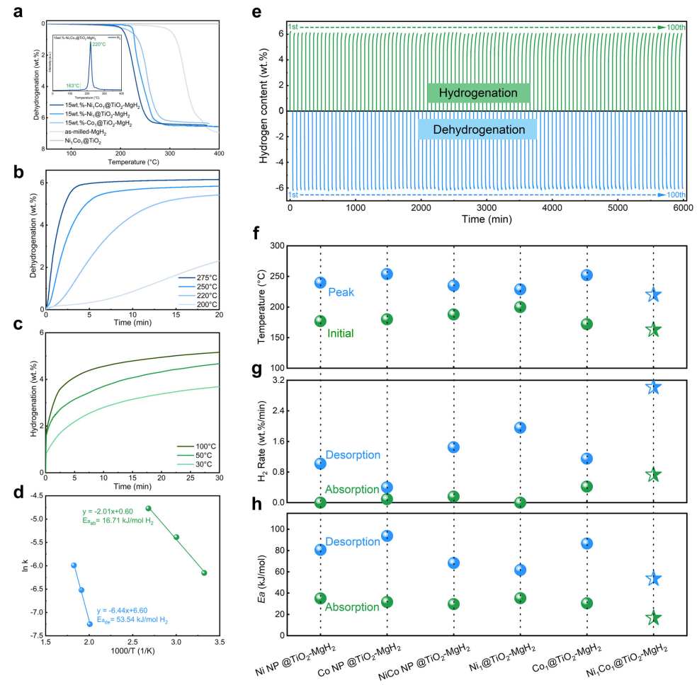 得益于上述金属原子和载体的协同作用,15 wt.% Ni₁Co₁@TiO₂-MgH₂复合材料展现出优异的吸放氢性能。其放氢起始温度低至168°C(相较纯MgH₂降低了212°C),放氢活化能从纯氢化镁的160 kJ/mol降至53.54 kJ/mol,吸氢活化能从87.3 kJ/mol降低至16.71 kJ/mol。并且该复合材料在275°C下1分钟内可释放超过3 wt.%的氢气,在30°C室温条件下30分钟内仍可吸收3.79 wt.% H₂。此外,经过100次吸放氢循环后,其储氢容量保持率高达97.6%,展现出卓越的循环稳定性(图2)。