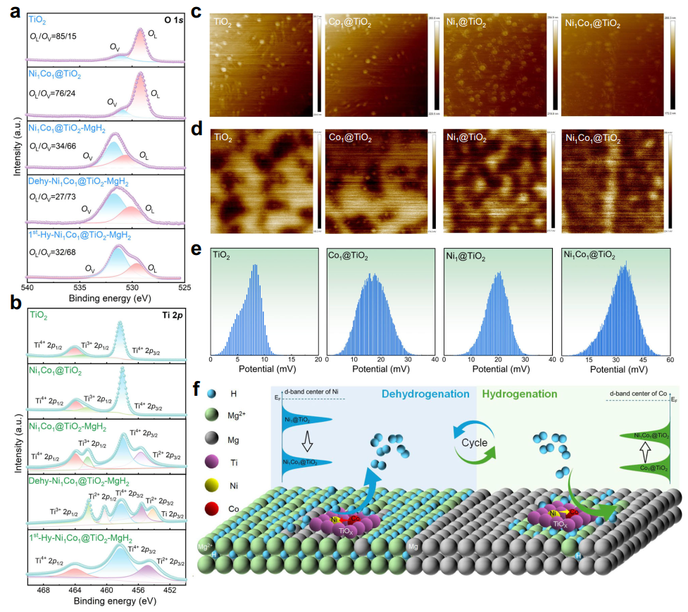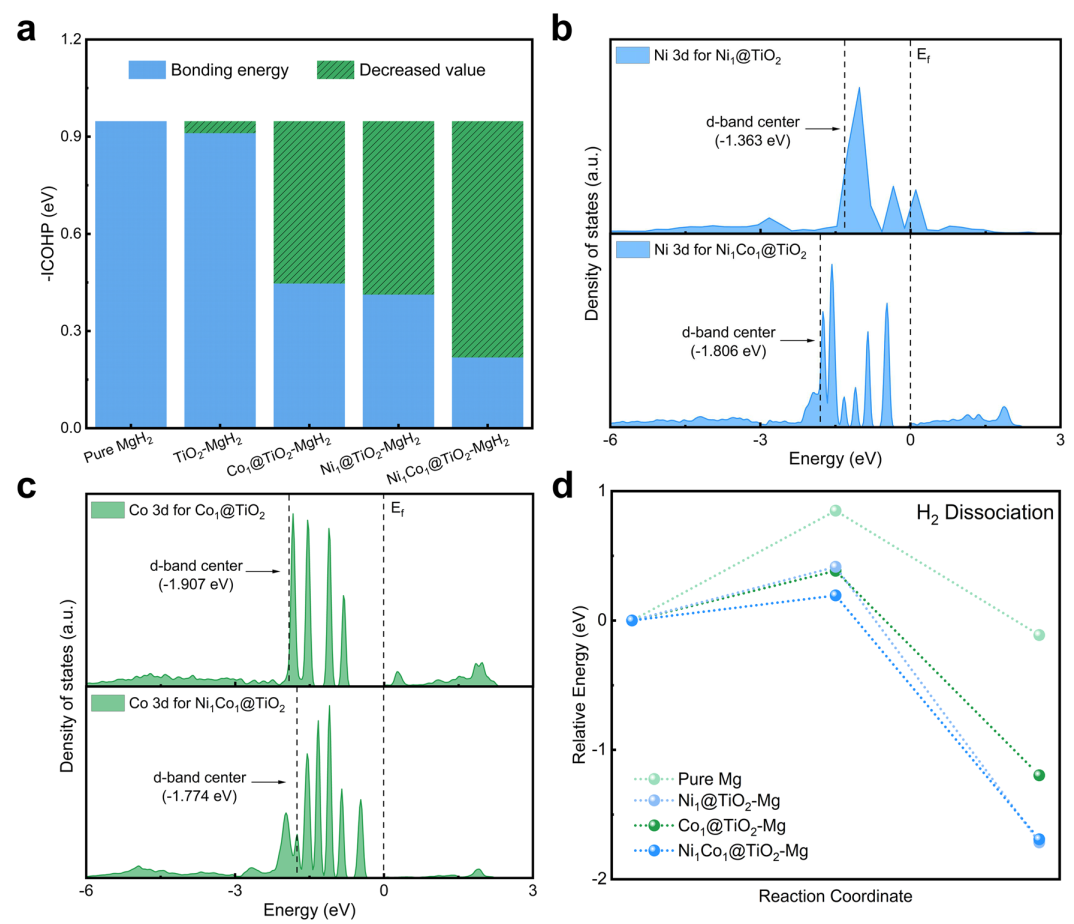 本研究突破传统单向催化剂的局限,利用Ni与Co两种金属原子的电子结构差异,在TiO₂载体上构筑了原子级分散的异核双原子催化剂(Ni₁Co₁@TiO₂),通过Ni与Co原子间的电子相互作用实现功能分工与协同。放氢过程中,Ni作为裂解Mg-H键的主要活性位点,Co通过下调Ni的d带中心进一步削弱Mg-H键能;吸氢过程中,Co作为解离H₂的主要活性位点,Ni通过上调Co的d带中心进一步优化H₂吸附与解离。这种动态的d带中心双向调控机制,解决了可逆储氢过程对吸氢与放氢的不同催化需求(图1)。