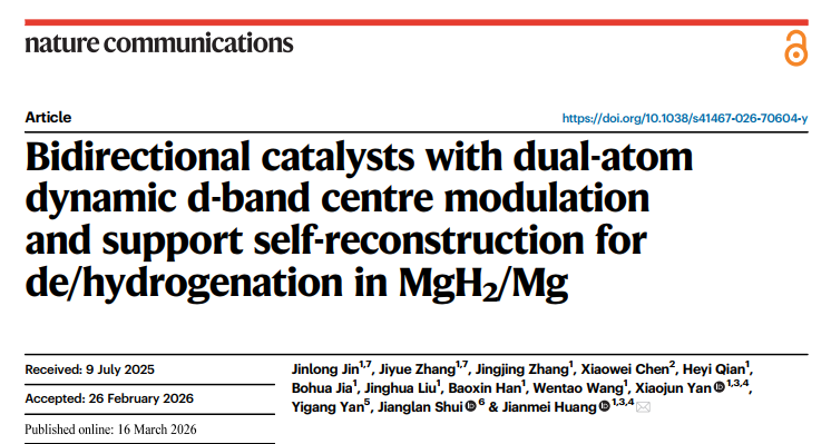 北航新闻网3月31日电(通讯员 车泓佐)氢化镁(MgH₂)因其高达7.6 wt.%的理论储氢密度和良好的安全性,被视为最具应用前景的固态储氢材料之一。然而,其实际应用受限于吸放氢反应动力学缓慢、反应温度过高。近日,北航能动学院黄建媚副教授、闫晓军教授团队与材料学院水江澜教授团队合作,报道了一种负载于TiO₂载体上的Ni/Co异核双原子催化剂,在MgH₂/Mg储氢体系中实现了高效双向催化。相关成果以“Bidirectional catalysts with dual-atom dynamic d-band centre modulation and support self-reconstruction for de/hydrogenation in MgH2/Mg”为题,发表在《Nature Communications》期刊上。文章第一作者是能源与动力工程学院2023级博士研究生靳金龙和2022级硕士研究生章继月,黄建媚副教授为该论文的通讯作者,北京航空航天大学能源与动力工程学院为第一单位。