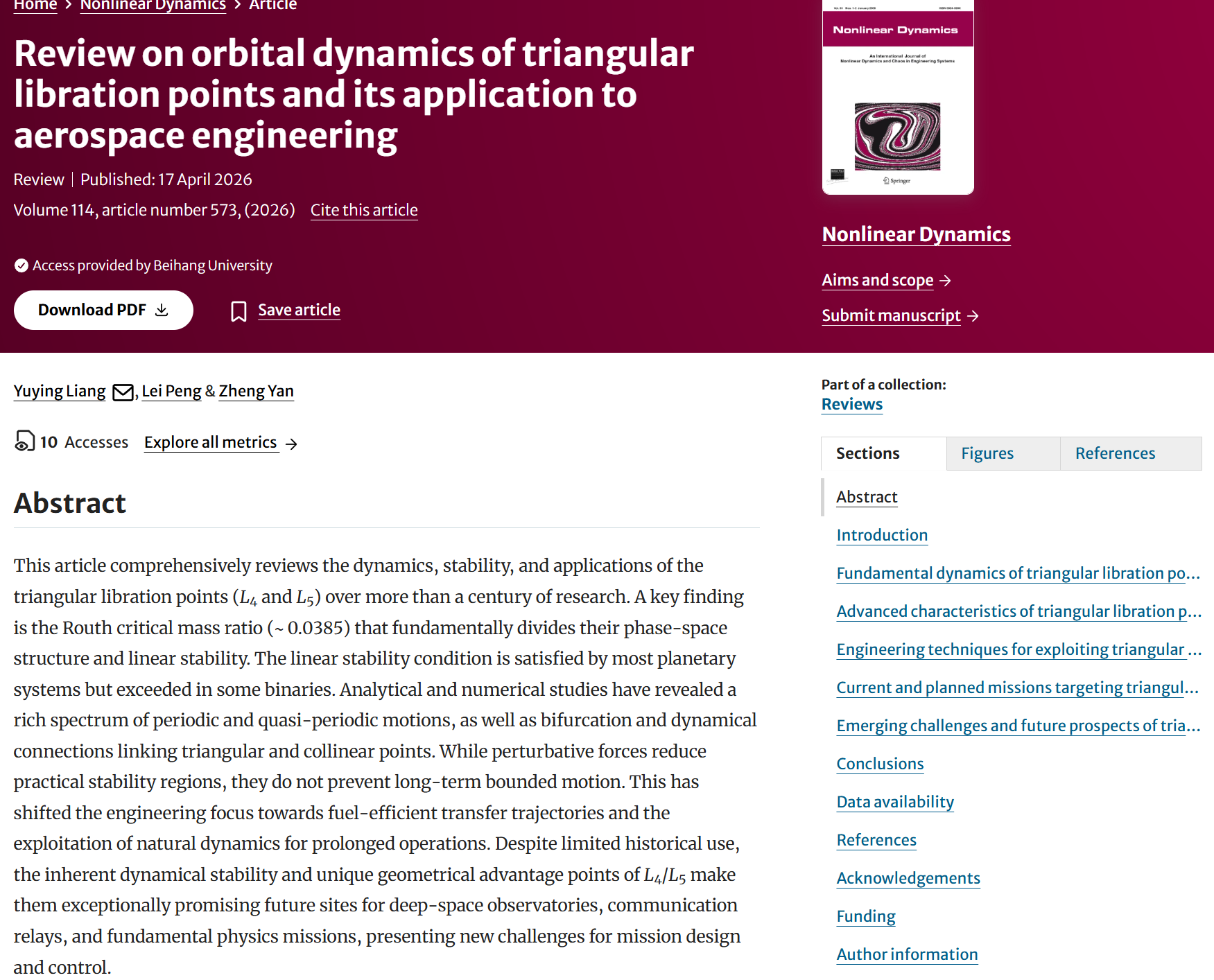 北航新闻网4月23日电(通讯员 梁玉莹)2026年4月,非线性动力学领域国际知名期刊《Nonlinear Dynamics》正式在线刊出宇航学院航天器设计优化与动态模拟技术教育部重点实验室的最新综述成果:“Review on Orbital Dynamics of Triangular Libration Points and Its Application to Aerospace Engineering”。该论文系统梳理并总结了1911-2025年间三角平动点轨道动力学领域的发展脉络,调研相关文献近三百篇,从经典天体力学理论出发,贯通非线性动力学方法与复杂轨道工程应用,构建起跨越百年的系统性知识框架与研究谱系,首次实现了该方向从理论体系到工程实践的整体性整合,填补了航天器动力学领域在三角平动点方向长期缺乏系统性、结构化总结的空白。