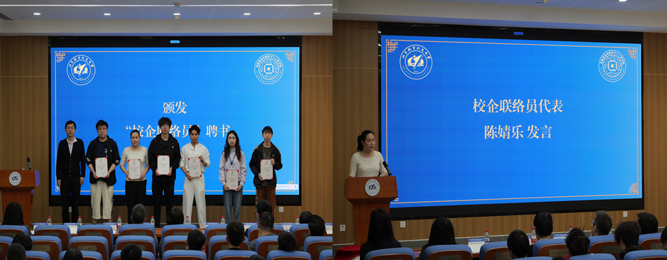 随后举行了校企联络员聘任仪式,学院为各位受聘校企联络员正式颁发聘书,以正式聘任筑牢校企合作坚实纽带。聘任环节结束后,联络员代表陈婧乐登台发言。她立足岗位职责作出郑重表态,将充分发挥桥梁纽带作用,高效衔接校企双方资源、畅通信息互通渠道,以务实行动深化多方联动,助力校企协同合作迈向更深层次、更广领域。