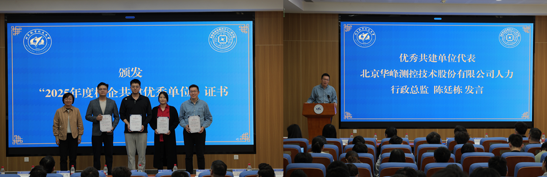 为表彰先进、深化合作,学院现场为2025年度校企共建优秀单位逐一颁发荣誉证书,以此肯定各企业长期以来在产教融合、人才培养工作中的鼎力支持。北京华峰测控技术股份有限公司人力行政总监陈廷栋作为优秀共建单位代表登台发言。他全面复盘了双方携手合作的亮眼成果,分享校企协同育人的宝贵经验,并诚挚展望未来,表态将持续深化校企双向赋能,并肩培育行业优质人才,实现互利共赢、长效发展。