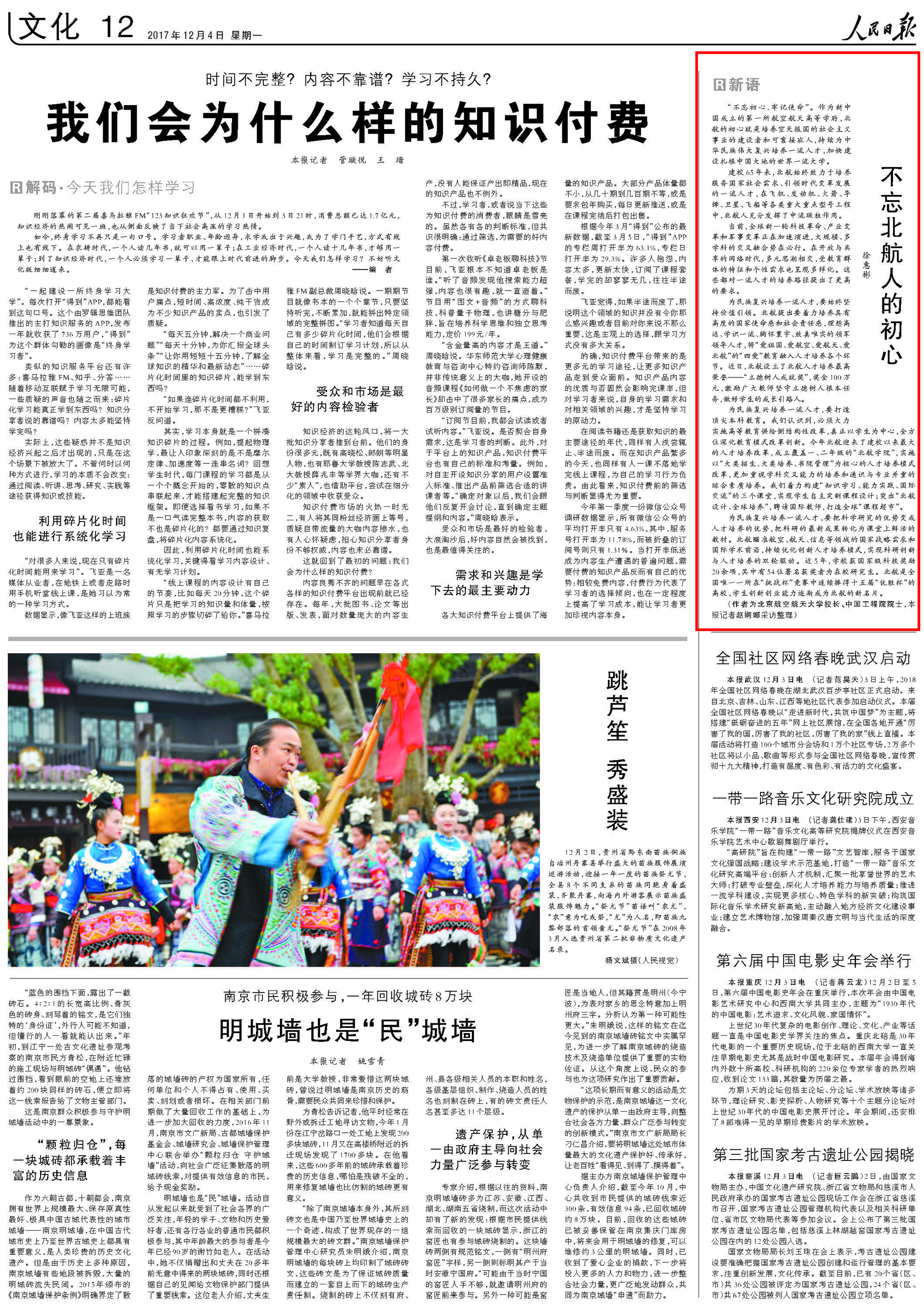 《人民日报》2017年12月4日文化12版刊登我校校长徐惠彬院士署名文章《不忘北航人的初心》: