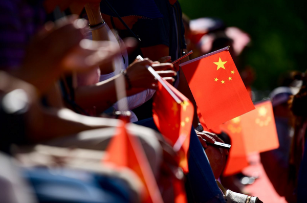北航附小的小学生,以韵律操、合唱、舞蹈和航模表演等多种形式,欢度节日。图为手拿国旗的学生们。 和冠欣 摄 任敏 文