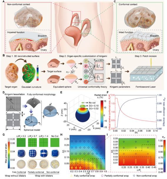 面对这一核心问题,常凌乾团队与徐晔团队合作,从传统“剪纸”艺术中汲取灵感,创造性地提出了“器官定制化剪纸共形理论”。该理论首次建立了剪纸结构几何参数(如单元尺寸、铰链宽度)与器官曲率、材料属性之间的定量关系,为器官进行“三维扫描”,并“智能生成”最合身的外衣尺寸,从而指导设计出在特定曲率器官上既能完全共形、又最大限度保留功能面积的剪纸贴片,有效覆盖率>95%,攻克了“高共形”与“高覆盖”不可兼得的难题。