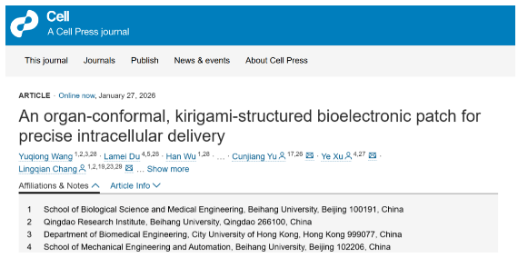 1月28日,国际顶级学术期刊《细胞》(Cell)发表了北京航空航天大学医学科学与工程学院常凌乾教授团队、机械工程及自动化学院徐晔教授团队,携手在前沿交叉医学领域取得的最新进展。他们联合北京大学第一医院、中国医学科学院肿瘤医院、香港城市大学、美国伊利诺伊大学等单位,研发出一款柔性可植入生物电子器件(POCKET),如同一个智能“口袋”,通过个性化定制,可实现完美贴合于复杂形状的器官表面,并通过“纳米电穿孔效应”,实现安全、高效、精准的全器官药物递送或基因转染。