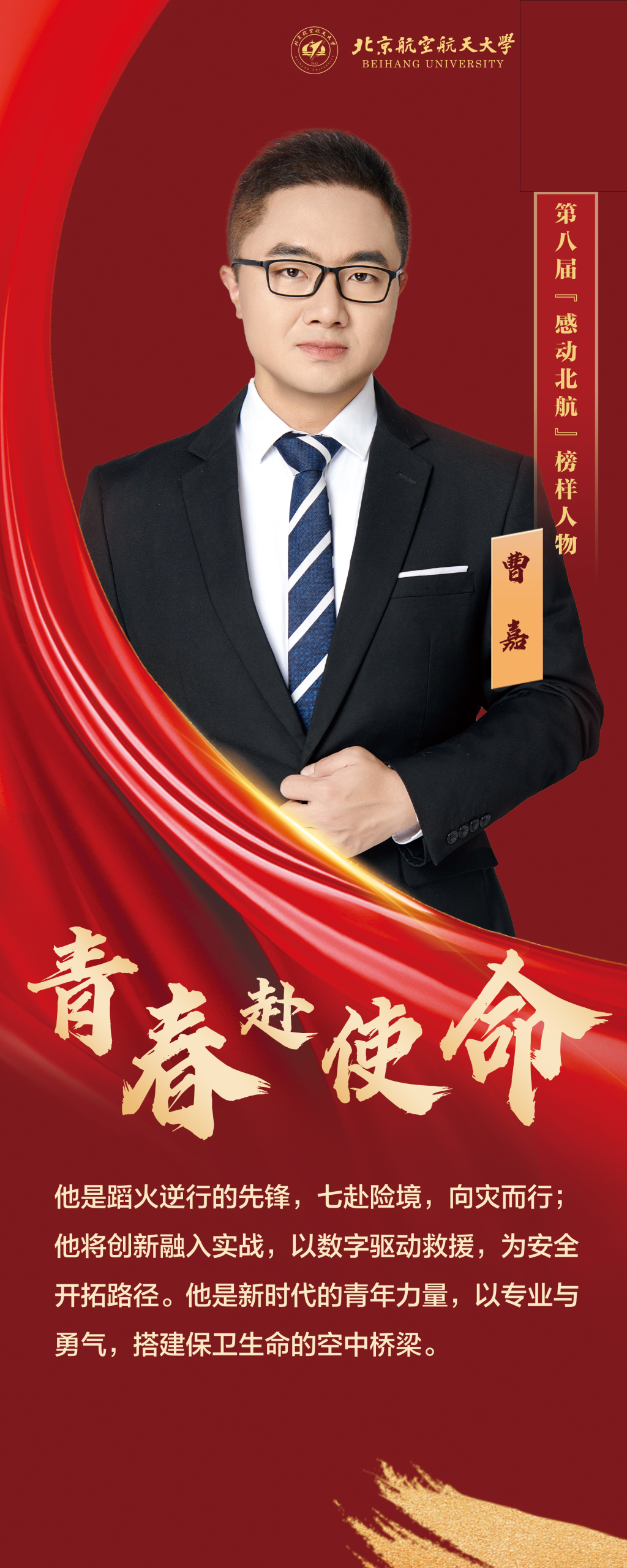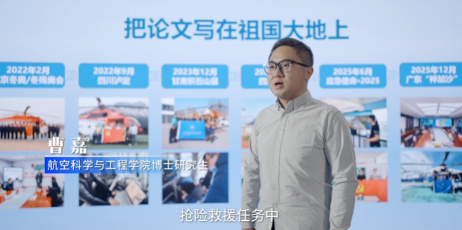 博士生曹嘉是航空工业国产航空救援装备“罗阳青年突击队”唯一学生成员,7次带队执行地震救援、森林灭火、冬奥应急等保障人民生命财产安全的国家重大任务。他不畏艰险,始终担当冲锋队长。作为学生第一设计人开发国内首套面向全灾种的航空应急救援数智辅助决策系统,多次运用在抢险救援一线。